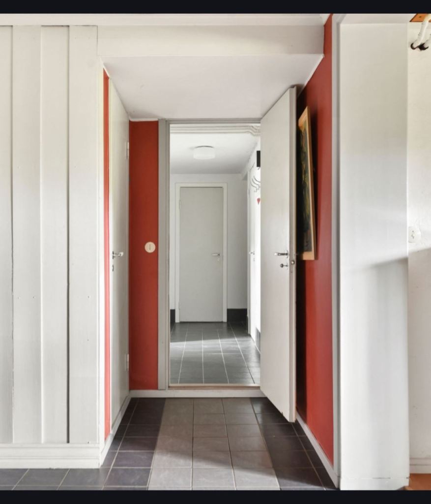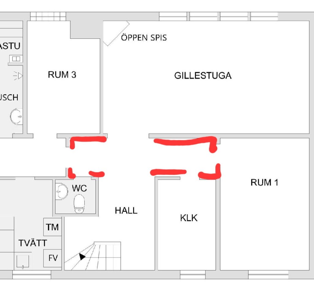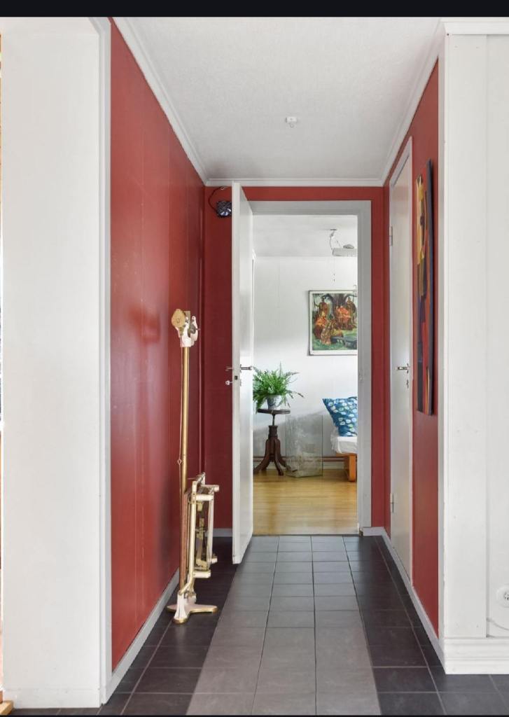 - Riva bort röda tapeter på de markerade väggpartierna i hall (se bilder)