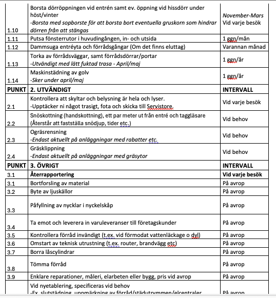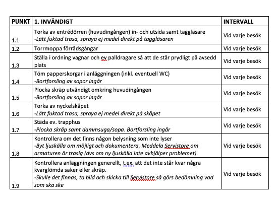 Det finns en checklista över vad som ska göras och hur ofta. Checklistan är uppdelad i:
